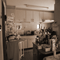 1FのLDKは白と濃茶の濃淡で空間にメリハリを。折り上げ天井に仕込まれた間接照明が空間を演出します。キッチンは既設のものを使用。新旧の違和感を感じさせない工夫を施し、統一感ある仕上げになりました。